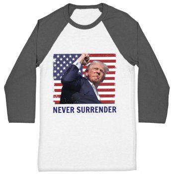 Never Surrender Trump Baseball T-Shirt – Pro-Trump Print Tee